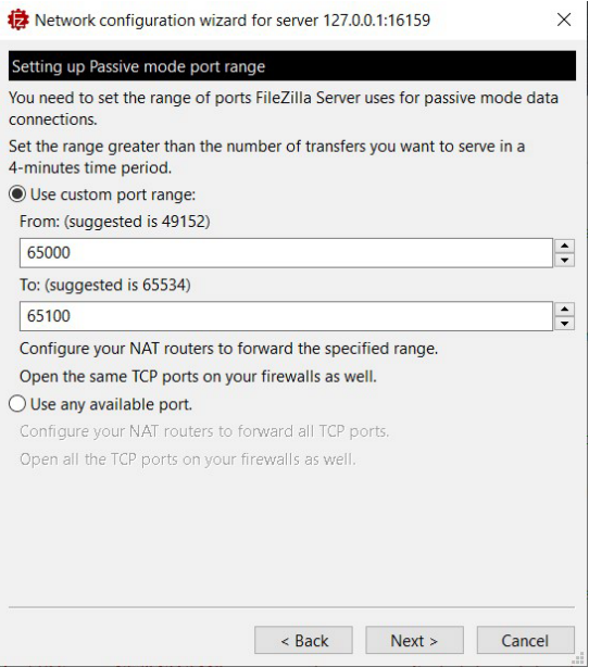 netsh advfirewall firewall add rule name="FTP Passive Mode" dir=in action=allow protocol=TCP localport=65000-65100