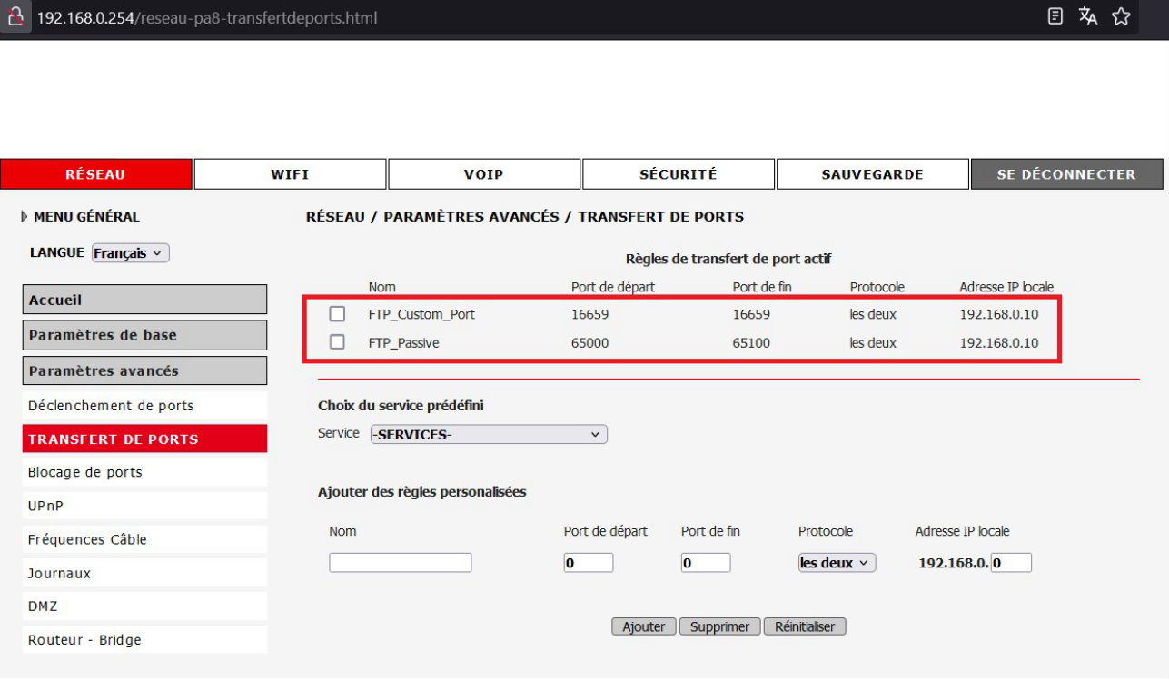 👉 Voici par ailleurs le paramétrage de la Box qui héberge le serveur FTPS ci-dessous.